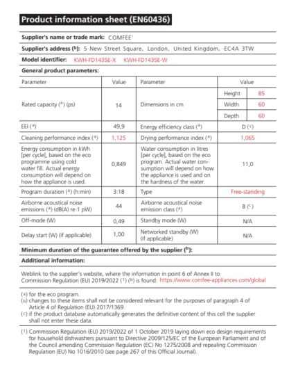 COMFEE’ Freestanding Dishwasher FD1435E-W with 14 place settings, Full Size, 44dB, Wide LED Display