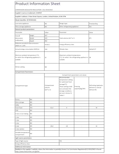 COMFEE’ RCT87WH2(E) 87L Under Counter Fridge Freezer, Interior Light, Adjustable Shelves