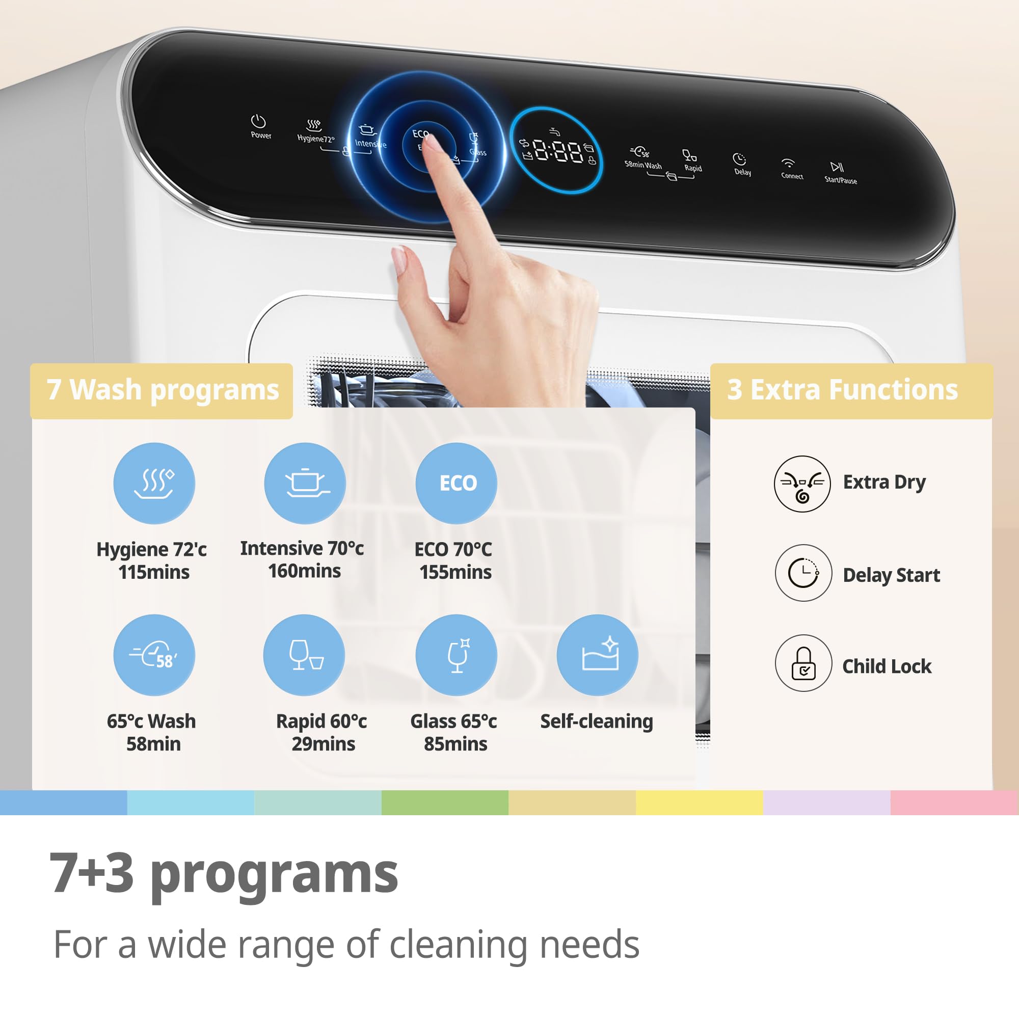- 【7+3 Programs】The table top dishwasher has 7 wash programs- Hygiene 72℃, Intensive, ECO, Glass, 58-minute Wash, Rapid and Self-Clean. Plus 3 extra functions including auto open drying, 1-24H delay start and child lock. These programs provide high flexibility to deliver the best cleaning results.