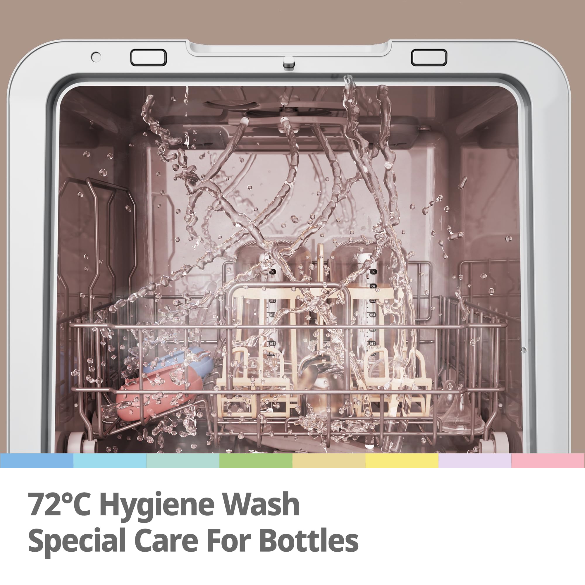 - 【72℃ Hygiene Wash】This mini dishwasher has 72℃ Hygiene Wash, it can tackle heavily soiled dishes and inhibit bacteria breeding.
