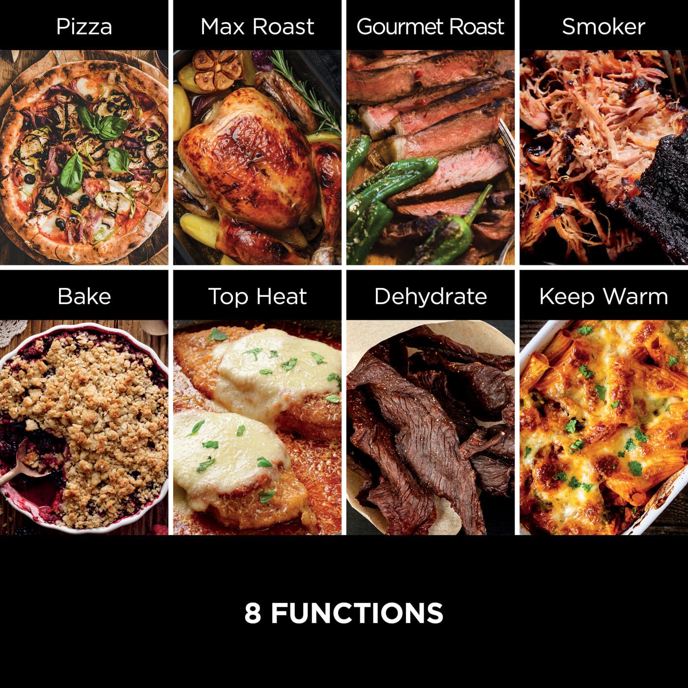 - 8-IN-1 OUTDOOR ROASTER OVEN, PIZZA OVEN & BBQ SMOKER: Pizza, Max Roast, Gourmet Roast, Top Heat, Bake, Smoker, Dehydrate & Keep Warm functions. Take the kitchen outdoors & unlock a world of flavours.