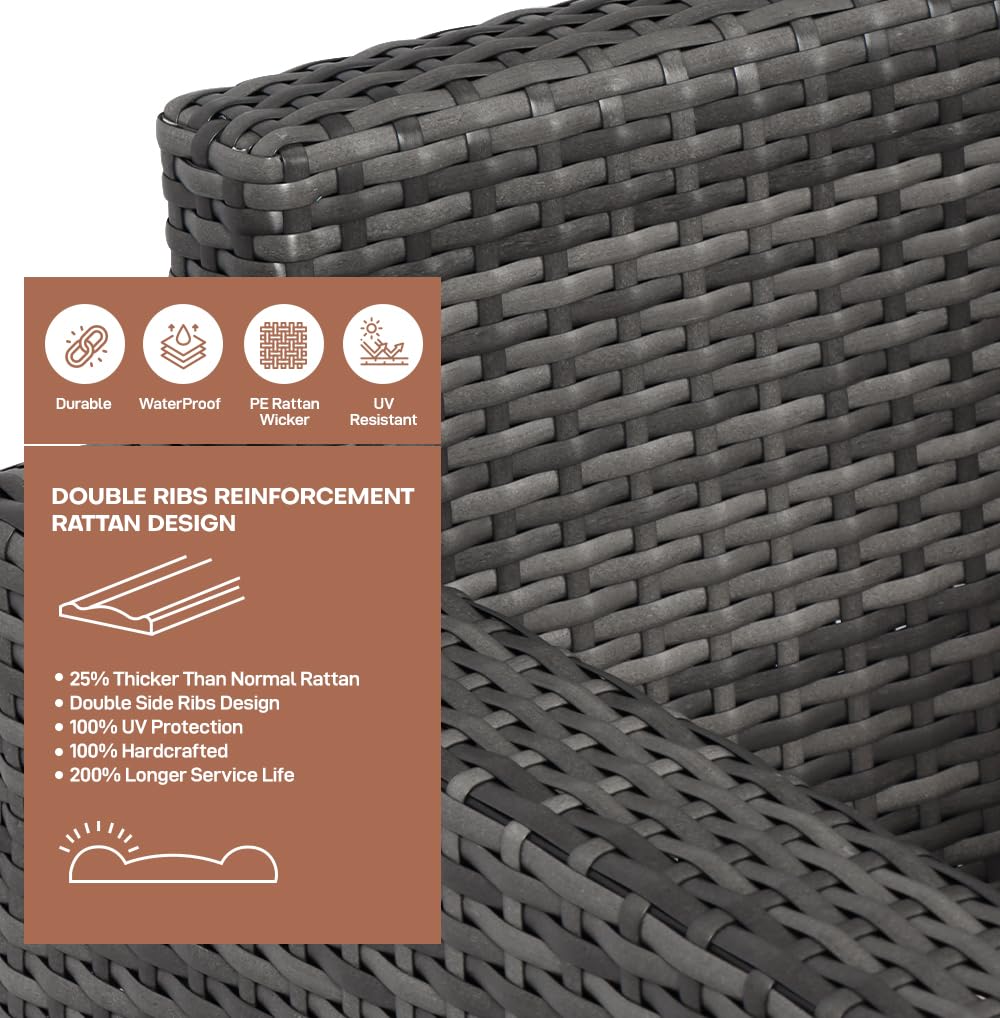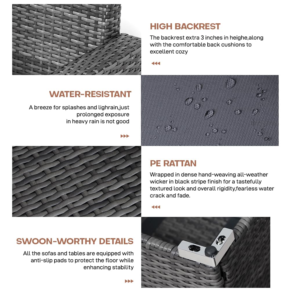 • 【HIGH-QUALITY MATERIAL】 This outdoor rattan furniture set is made with durable, UV-resistant PE rattan weave, ensuring it remains fade-resistant and weatherproof year-round. The high-quality construction ensures that this patio furniture withstands the elements and looks great for years.